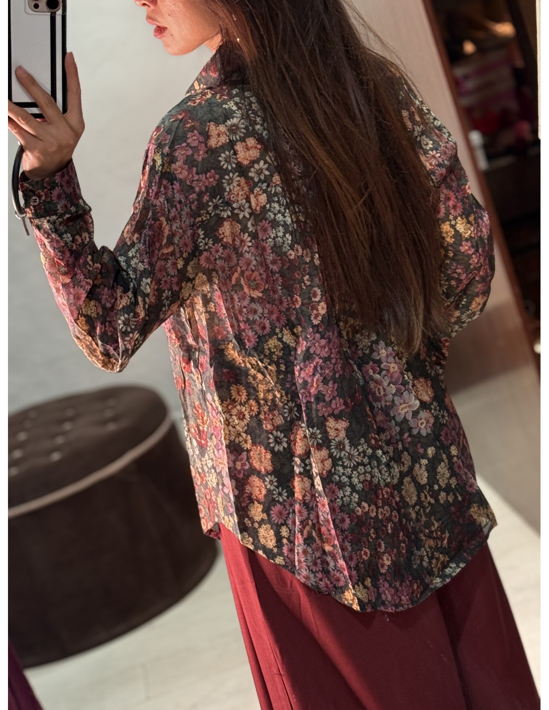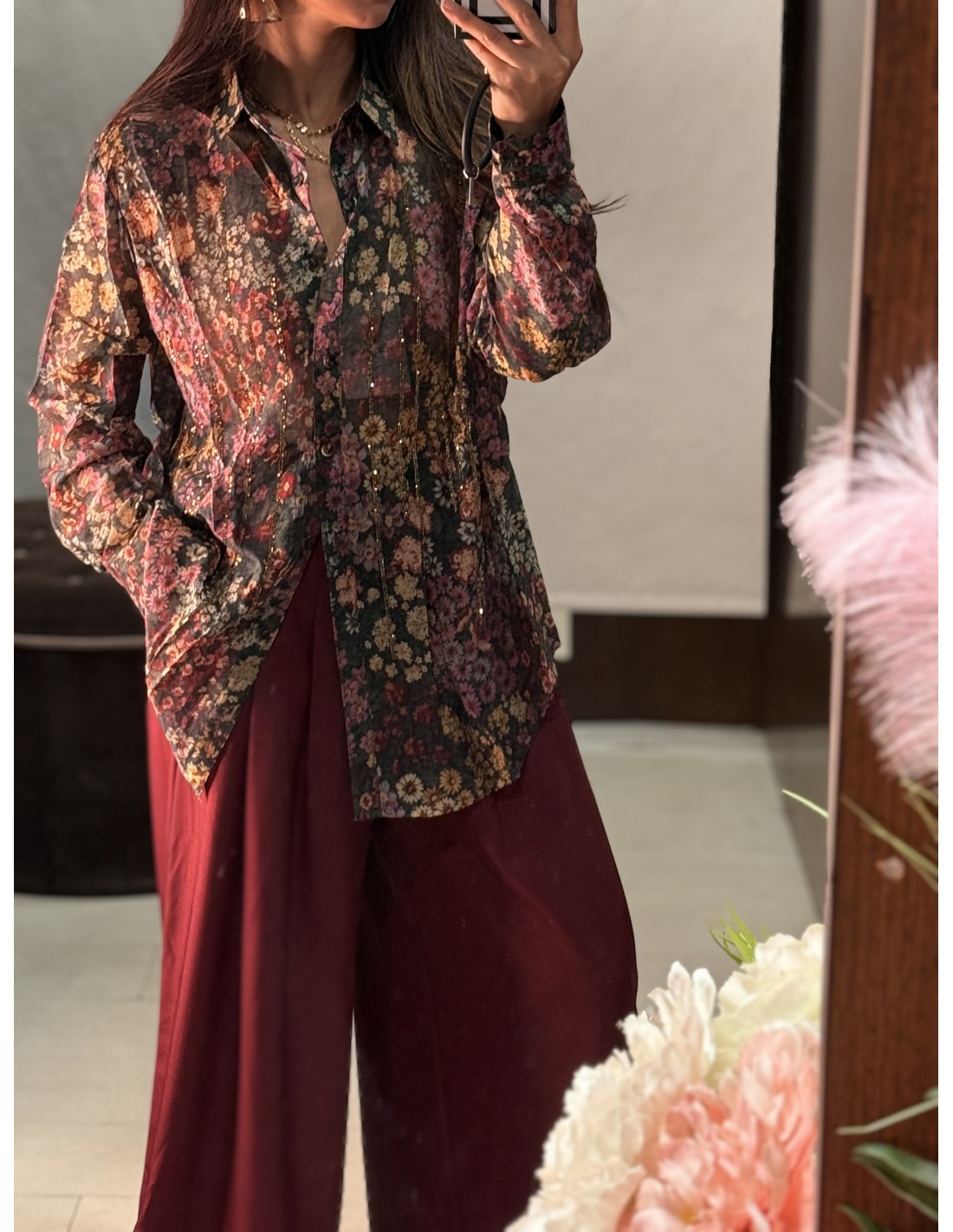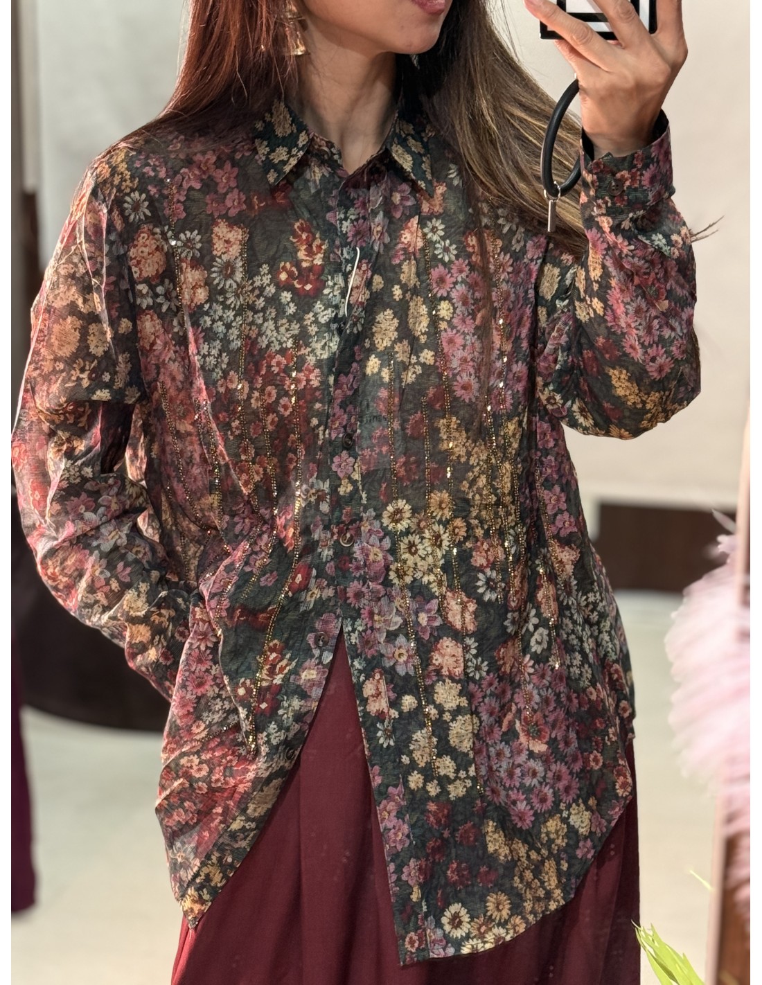 CAMISA ESTAMPADA COMBIANDA CON DETALLES DE BRILLO ZONA PECHO, CIIERRE BOTONES DELANTERO .