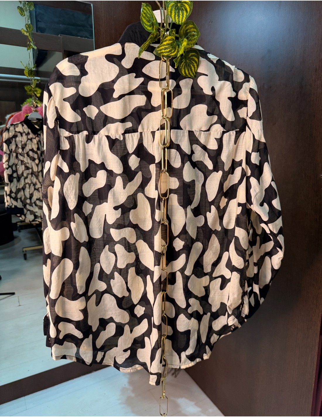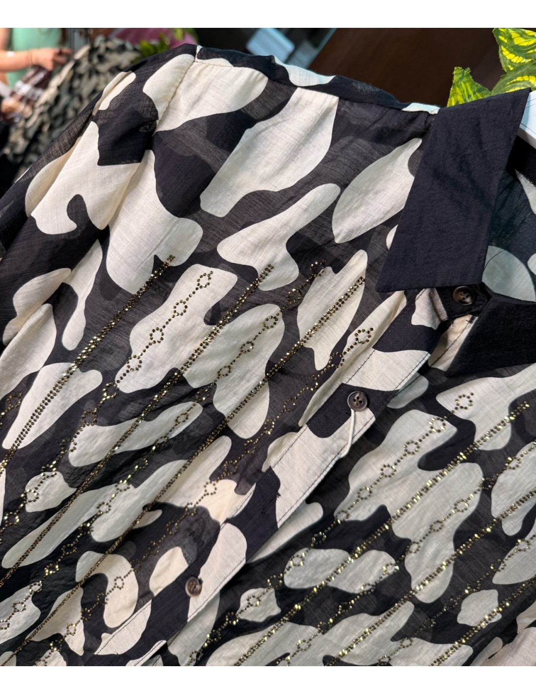 CAMISA ESTAMPADA COMBIANDA CON DETALLES DE BRILLO ZONA PECHO, CIIERRE BOTONES DELANTERO .