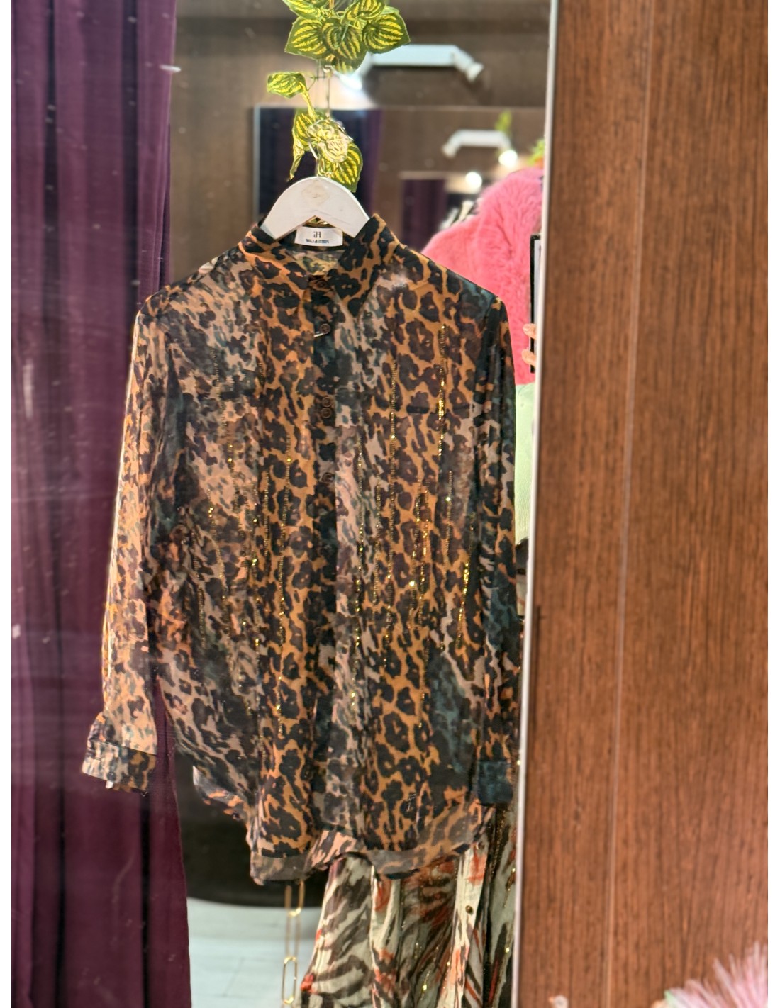 CAMISA ESTAMPADA COMBIANDA CON DETALLES DE BRILLO ZONA PECHO, CIIERRE BOTONES DELANTERO .