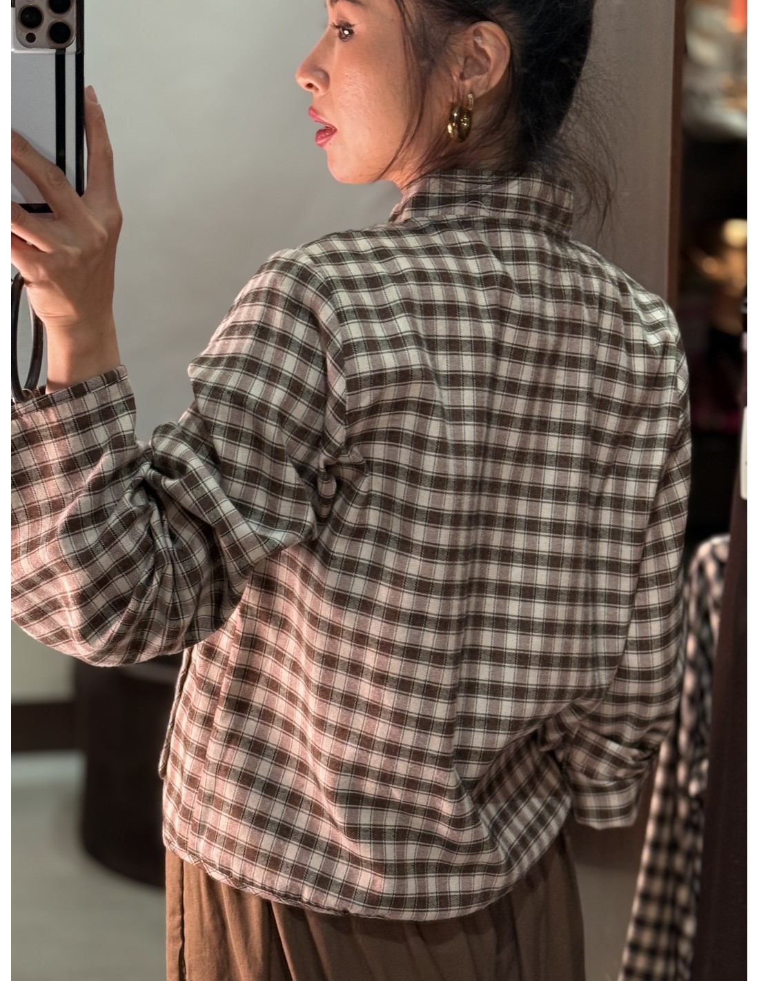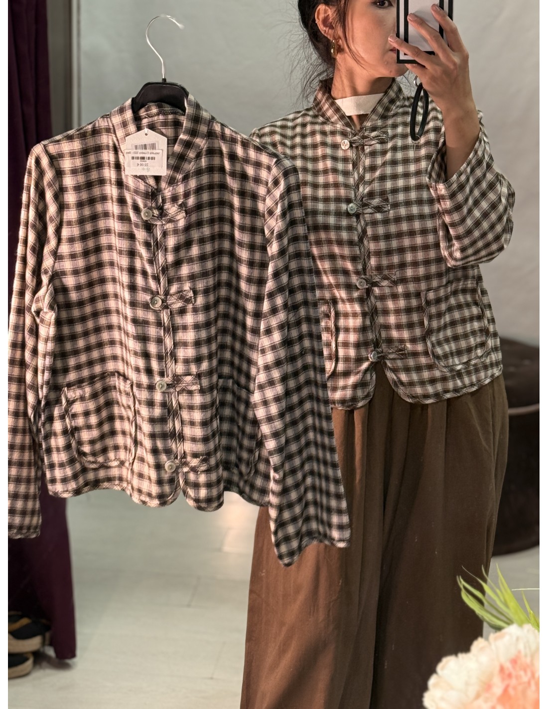 CAZADORA CON ESTAMPADO DE CUADRO CON CIERRE BOTON ,TELA NO LLEVA ELASTICO Y LLEVA BOLSILLOS DELANTERO .