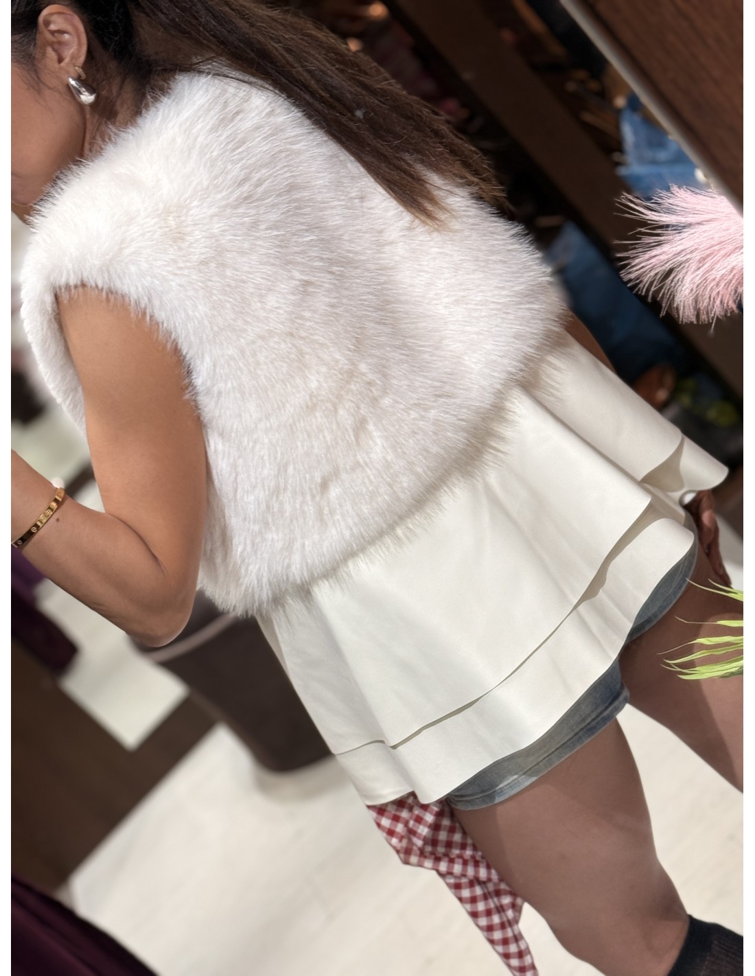 CHALECO DE PELO PELUCHE COMBINADA CON DOBLE VOLANTES DE POLI PIEL ,NO LLEVA CIERRE