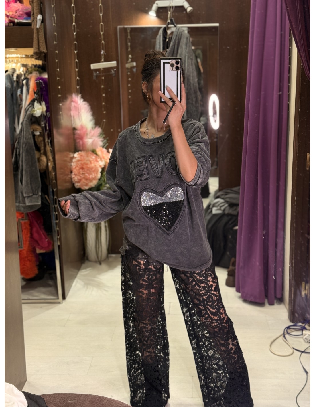 SUDADERA GRIS TELA CON EFECTO ENVEJECIDO ,LOGO PARTE PECHO DE INICIAL CON CORAZON DE LENTEJUELAS.